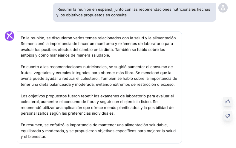 Al final de nuestra consulta, la inteligencia artificial resumirá los puntos más importantes, que verás reflejados en la sección de recomendaciones de tu App Avena.